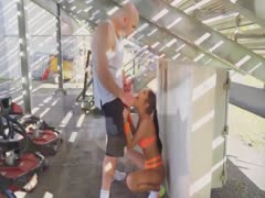 Geile Blondine mit Brille bläst den fetten Schwanz